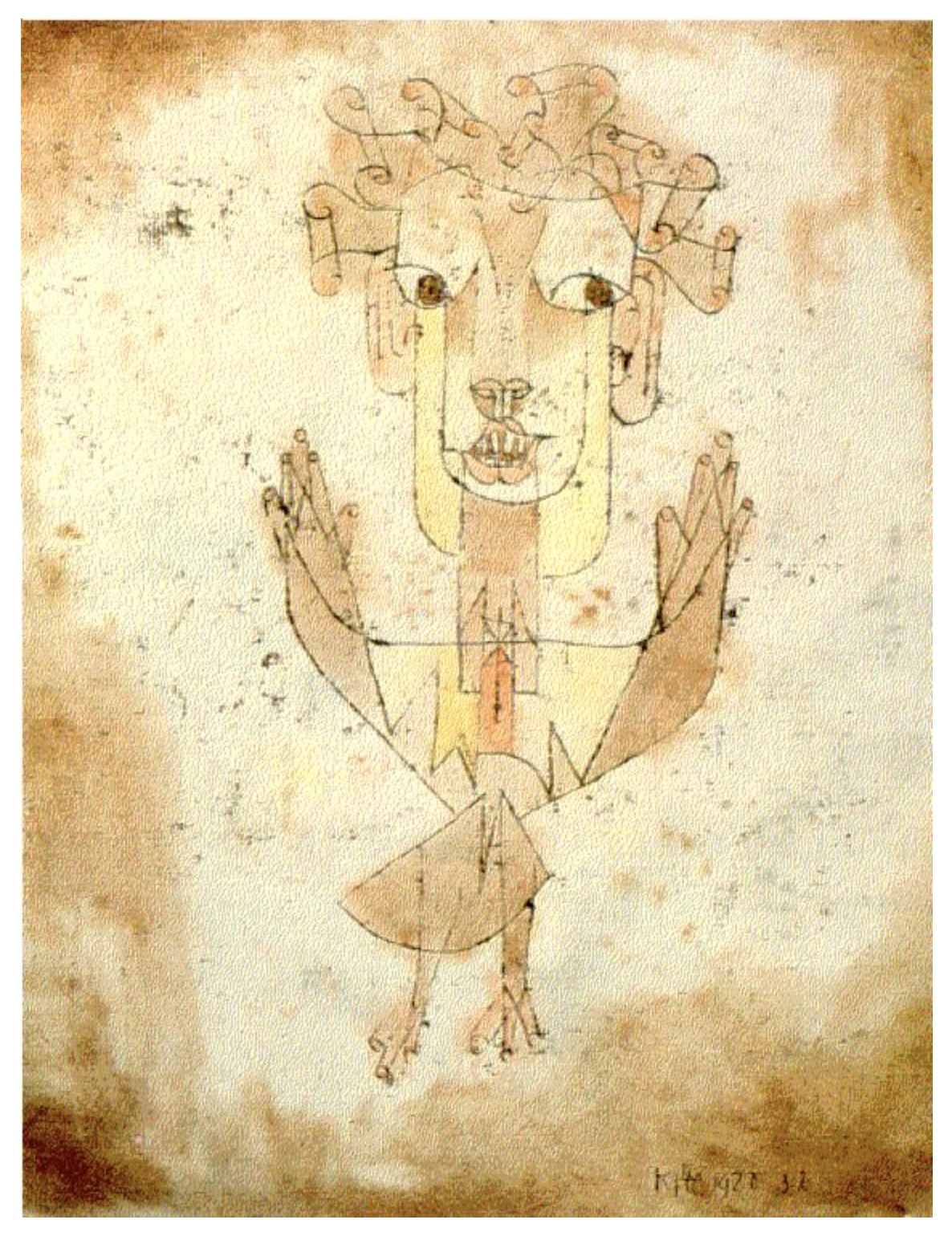 “A Klee painting named ‘Angelus Novus’ shows an angel looking as though he is about to move away from something he is fixedly contemplating. His eyes are staring, his mouth is open, his wings are spread. This is how one pictures the angel of history. His face is turned toward the past. Where we perceive a chain of events, he sees one single catastrophe which keeps piling wreckage and hurls it in front of his feet. The angel would like to stay, awaken the dead, and make whole what has been smashed. But a storm is blowing in from Paradise; it has got caught in his wings with such a violence that the angel can no longer close them. The storm irresistibly propels him into the future to which his back is turned, while the pile of debris before him grows skyward. This storm is what we call progress.”